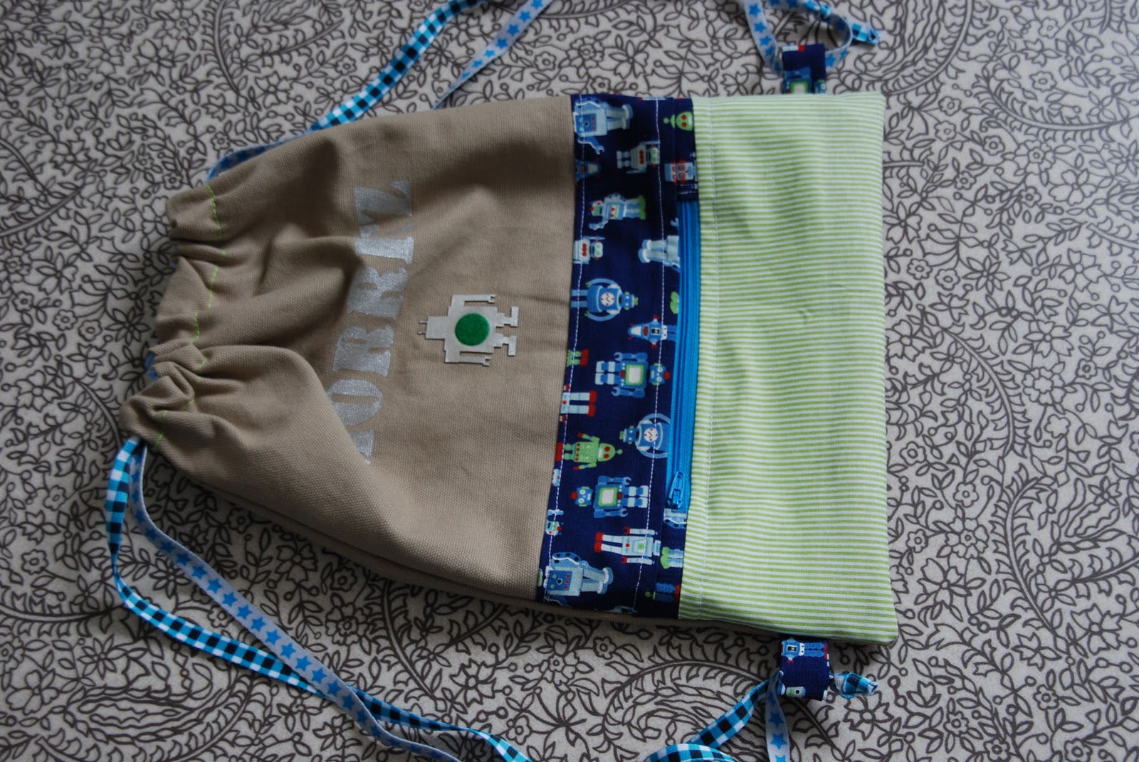 Ik had nog wat stof over van het robot kussen en ik had de smaak te pakken met het freezer paper, dus ik ging aan de slag. Ik denk dat ik het stuk over het ritszakje verdeeld over 3 avonden wel 50 keer heb gelezen en geanalyseerd en droog geoefend voordat ik het aandurfde. Ik ben namelijk niet zo goed met ritsen. Als dat deel in het werkstuk aan de orde is ga ik eerst koffie drinken, nog een keer lezen hoe het moet, etc. Ritsenfaalangst, drempelvrees, ik weet het niet. Maar het is gelukt en het naaien zelf ging allemaal in een keer goed! Ik ben supertrots op mezelf en het resultaat. Ik ga Morritz zo van school halen en dan maar hopen dat hij hem ook mooi vindt!